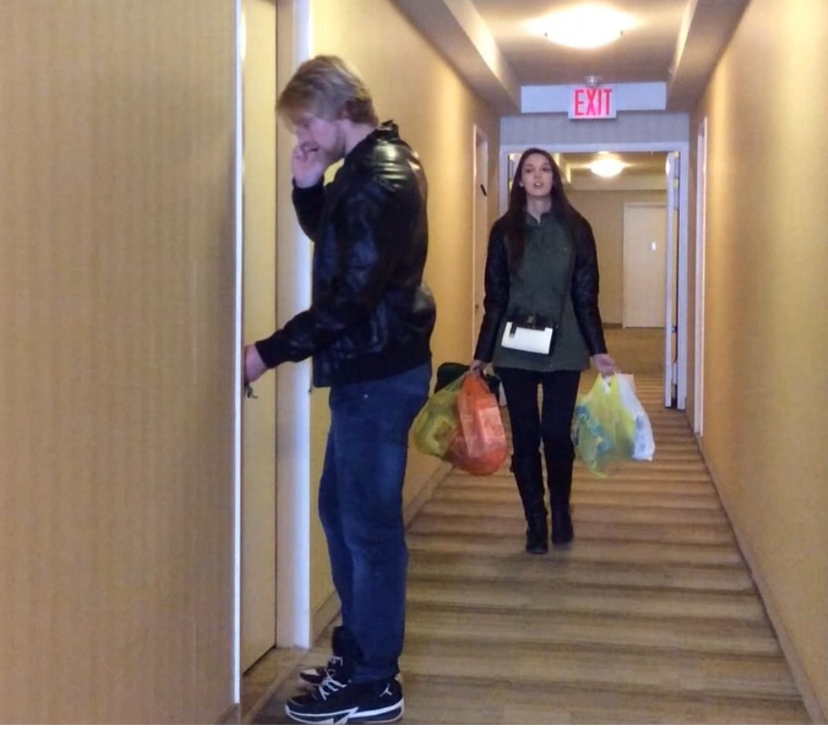 After a long and tiresome grocery and household shopping trip, a necessary but tedious task, Seanie is blissfully engrossed in his phone and completely unaware that Rachy is struggling behind him with every bag of items that they have purchased. Feeling like she is carrying a small baby elephant all the way from the shops, on public transport and finally feeling the accomplishment of making it back to the apartment she falls short of actually making it through the doorway. Becoming weary of this constant situation, Rachy decides to turn the tides, put her husbands muscles to the test and let him do some heavy lifting instead…much to her delight…